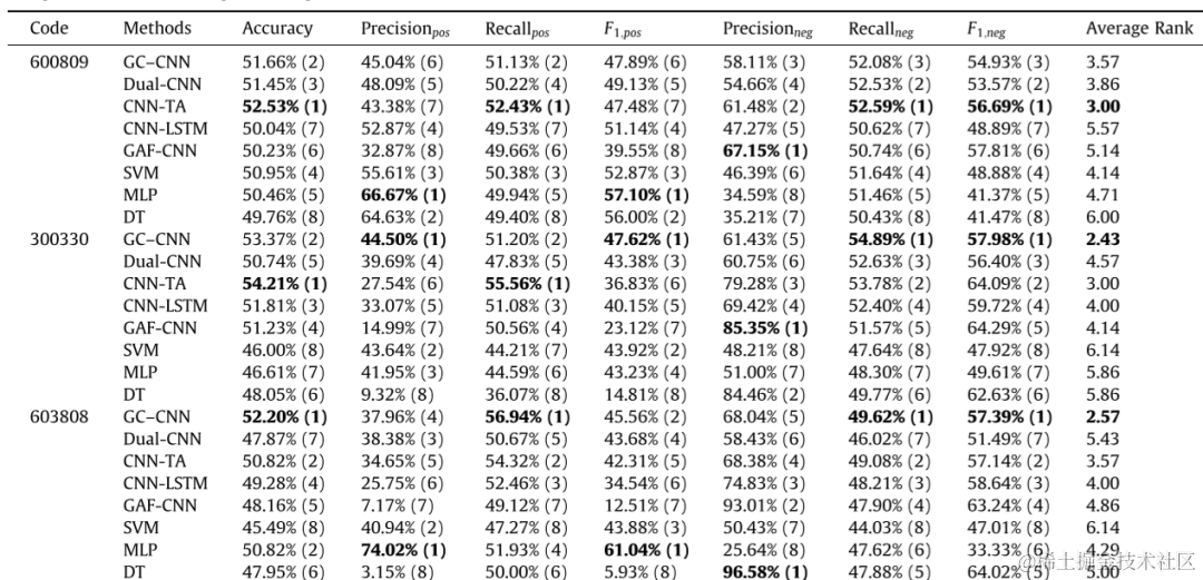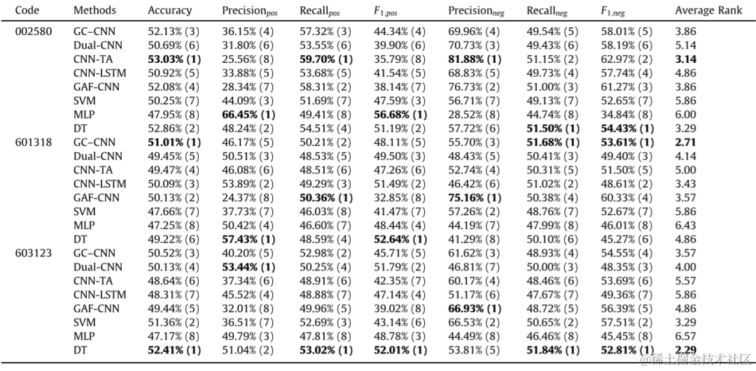 在进行预测效果的评估时,用到了Dual-CNN,CNN-TA,CNN-LSTM,GAF-CNN,SVM,MLP以及DT作为对比方法。下面展示了部分实验结果:\