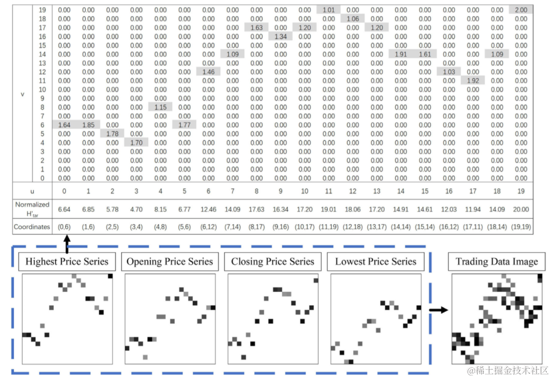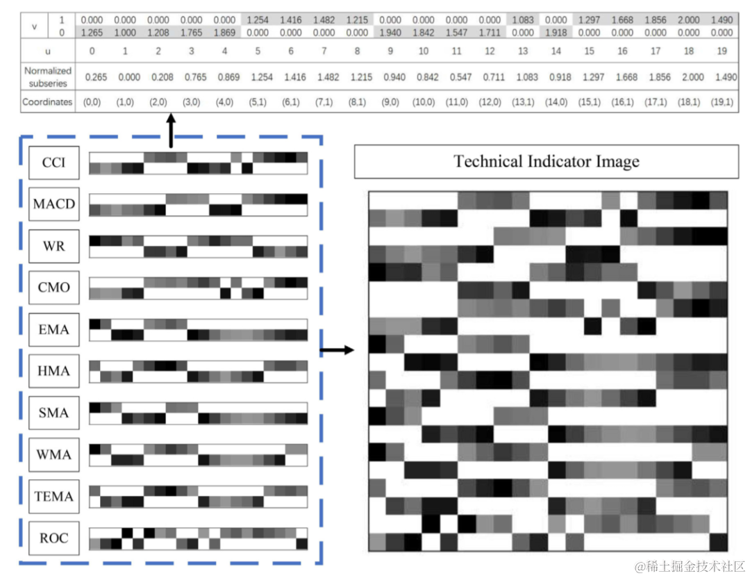 为了增强预测能力,类似的方式,十个技术指标序列也可以按照上面的方式来转换为一个图像,只不过是这里是按照垂直方向进行拼接得到的单通道图像。一个将技术指标转换为图像的例子如下图所示:\