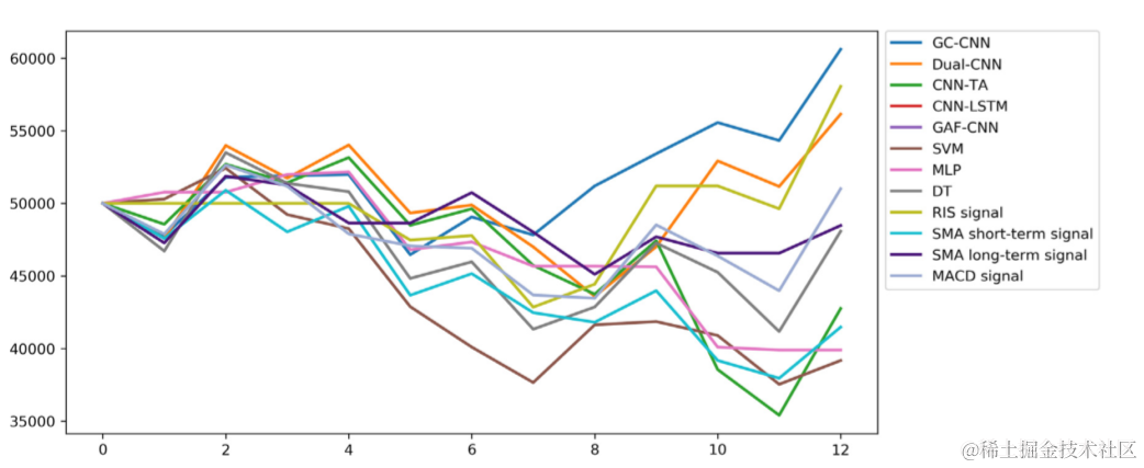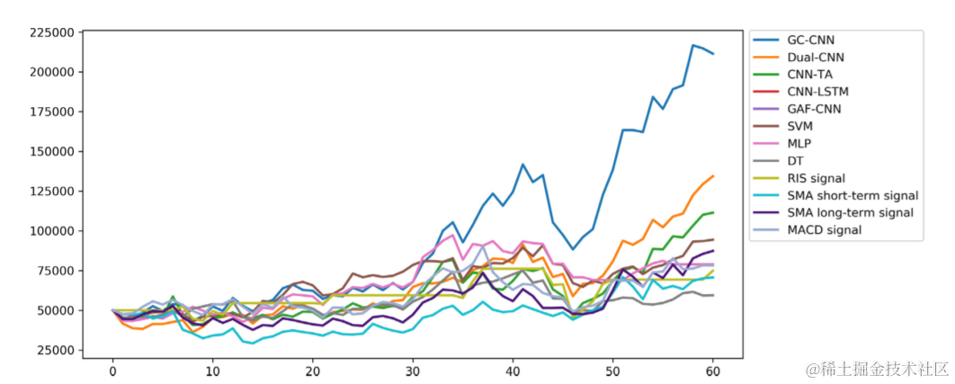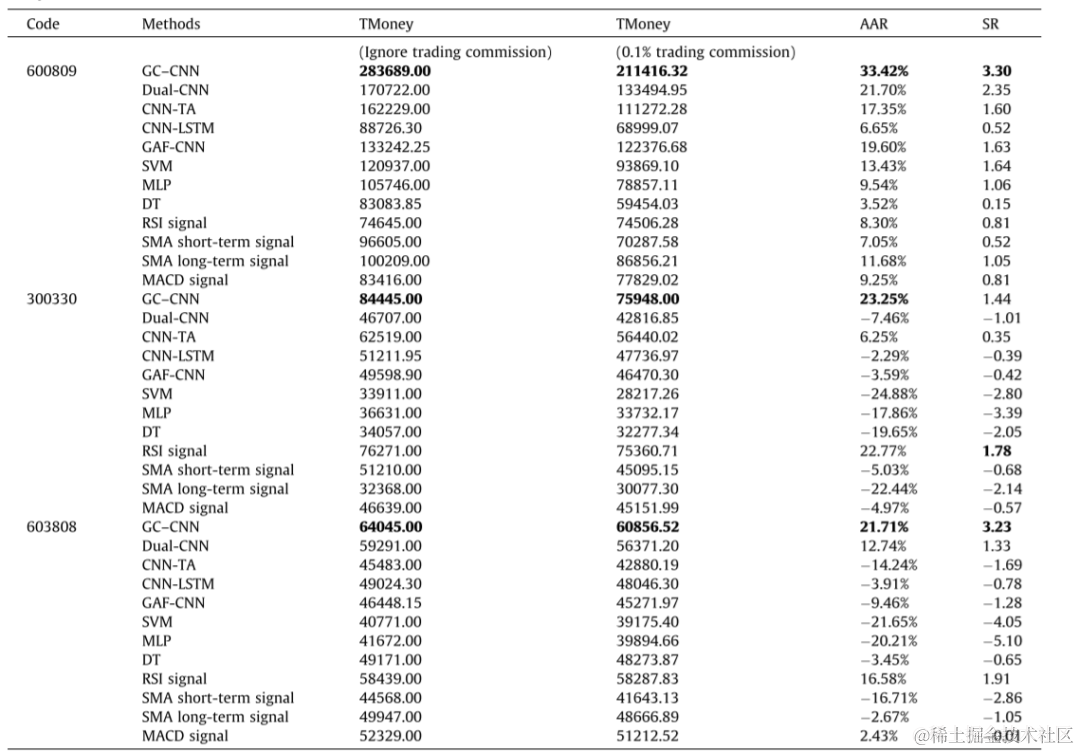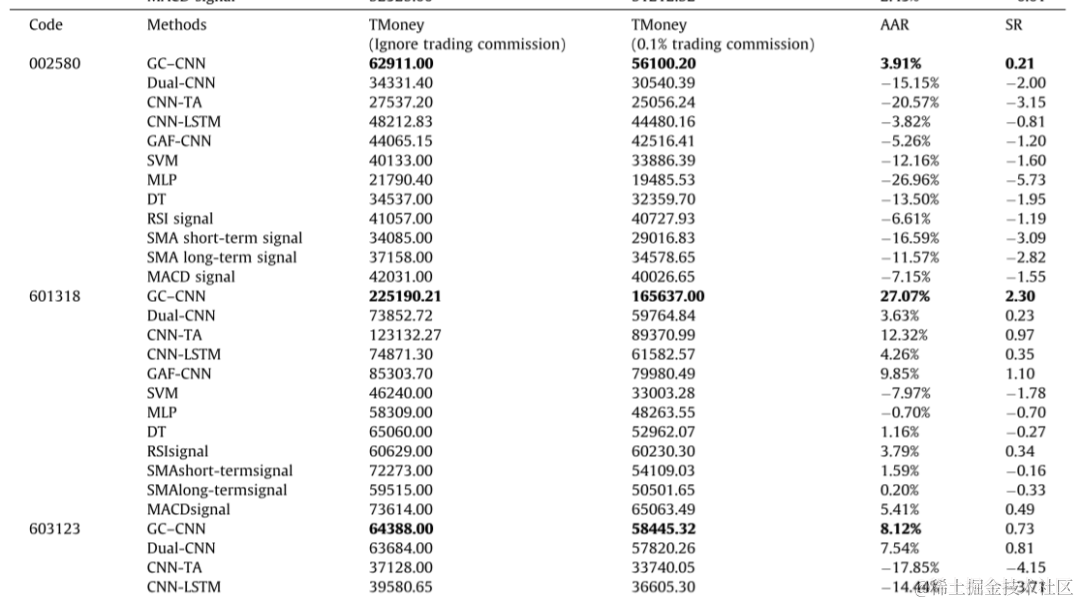 - 为了验证所提出的基于GC-CNN的方法的性能,实验结果从计算性能和财务性能两个方面进行了评价。在计算性能评价方面,所提出的基于GC-CNN的方法与几种趋势预测方法进行了比较。在财务评价中,文中根据不同的预测和几种常见的股票交易策略模拟股票交易。