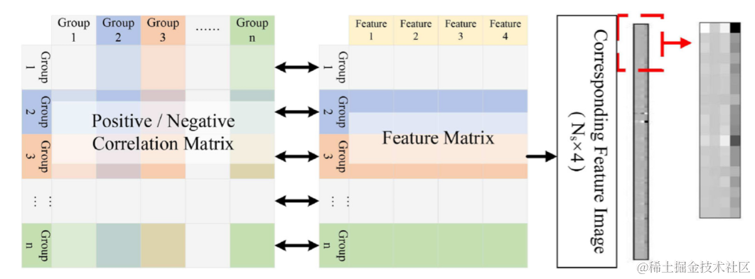 之后,对于每个正相关和负相关矩阵 和 ,我们构建一个响应的特征矩阵 ,其中每个股票的四个特征作为一行,之后通过对角度矩阵进行归一化,这样在每个时刻就可以得到对应的特征图像了。这个过程如下图所示: