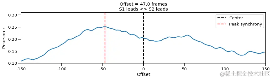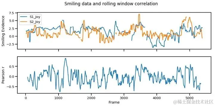 再次重申,所有的皮尔逊 r 值都是用来衡量全局同步的,它将两个信号的关系精简到了一个值当中。尽管如此,使用皮尔逊相关也有办法观察每一刻的状态,即局部同步性。计算的方法之一就是测量信号局部的皮尔逊相关,然后在所有滑动窗口重复该过程,直到所有的信号都被窗口覆盖过。由于可以根据你想要重复的次数任意定义窗口的宽度,这个结果会因人而异。在下面的代码中,我们使用 120 帧作为窗口宽度(4 秒左右),然后在下图展示出我们绘制的每一刻的同步结果。