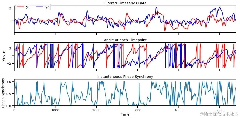 瞬时相位同步测算是计算两个信号每一刻同步性的很好的方法,并且它不需要我们像计算滑动窗口相关性那样任意规定窗口宽度。