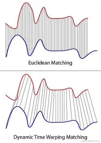 动态时间扭曲(DTW)是一种计算两信号间路径的方法,它能最小化两信号之间的距离。这种方法最大的优势就是他能处理不同长度的信号。最初它是为了进行语言分析而被发明出来,DTW 通过计算每一帧对于其他所有帧的欧几里得距离,计算出能匹配两个信号的最小距离。一个缺点就是它无法处理缺失值,所以如果你的数据点有缺失,你需要提前插入数据。