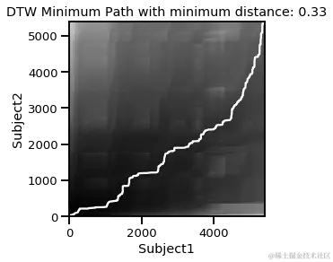 如图所示我们可以看到白色凸形线绘制出的最短距离。换句话说,较早的 Subject2 数据和较晚的 Subject1 数据的同步性能够匹配。最短路径代价是d=.33,可以用来和其他信号的该值做比较。