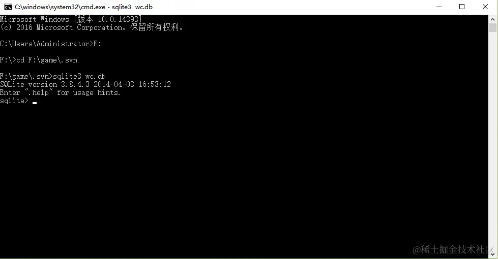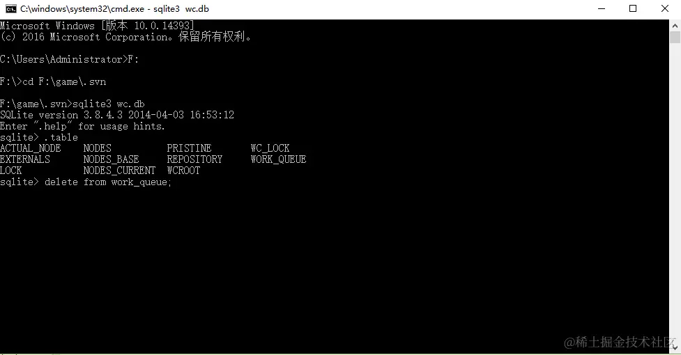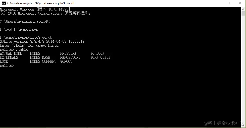 三、运行cmd,进入到你的.svn所在的路径下,执行sqlite3 wc.db;