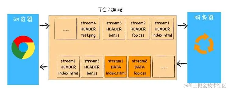 基于之前的问题,HTTP/2 的思路就是一个域名只使用一个 TCP 长连接来传输数据,这样整个页面资源的下载过程只需要一次慢启动,同时也避免了多个 TCP 连接竞争带宽所带来的问题。另外,就是队头阻塞的问题,等待请求完成后才能去请求下一个资源,这种方式无疑是最慢的,所以 HTTP/2 需要实现资源的并发请求,也就是任何时候都可以将请求发送给服务器,而并不需要等待其他请求的完成,然后服务器也可以随时返回处理好的请求资源给浏览器。所以,HTTP/2 的解决方案可以总结为:一个域名只使用一个 TCP 长连接和消除队头阻塞问题(但还是存在tcp阻塞的问题)。可以参考下图: