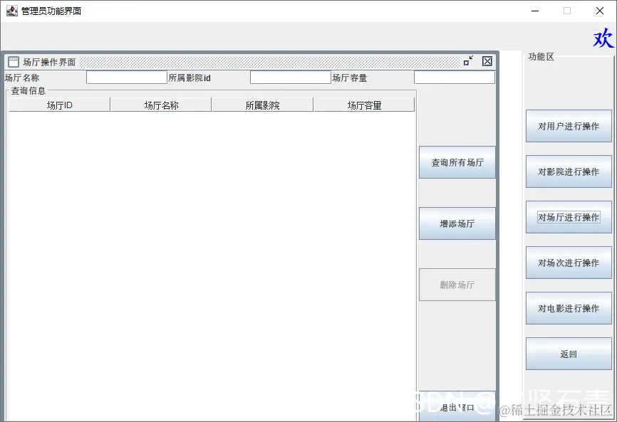 3.对场厅进行操作:场厅信息的查询、删除、增加;