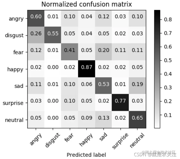 该架构在性别分类任务中获得95%的 准确度。此外,在FER-2013数据集中情感分类任务中获得了 66% 的准确度。最终模型的权重可以存储在 855 KB 的文 件中。通过降低模型的计算成本使其具有实时性,并且能够 连接两个模型并在同一图像中使用。 Normalized confusion matrix of our mini-Xception network.