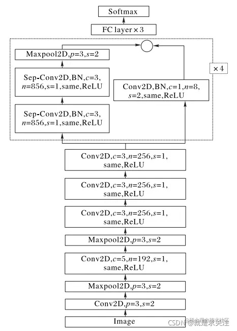该模型主要由6个卷积层和3个最大池化层构成,每一个卷积层进行卷积操作后进行一个 same 填充,当卷积核移动步长为 1 时,图像尺寸不变,同时为了固定网络层中输入的均值和方差并避免梯度消失问题,将每层神经网络任意神经元的输入值的分布拉回到均值为 0、方差为1的比较标准的正态分布,使用批规范化方法,在每一层加上一个批规范化(Batch Normalization,BN)操作,并用 ReLU函数激活,后面连接 3 个全连接层和 1 个输出层的 Softmax 函 数,在全连接层之后使用一个 Dropout的方法,在训练中随机丢弃神经元防止过度训练。本文设计的卷积神经网络结构如图所示,其中c为卷积核的大小,n为卷积核的数量,s为卷积步长,p为池化窗口的大小same 表示使用 same 的填充方式,ReLU为激活函数,Sep-Conv为深度可分卷积。