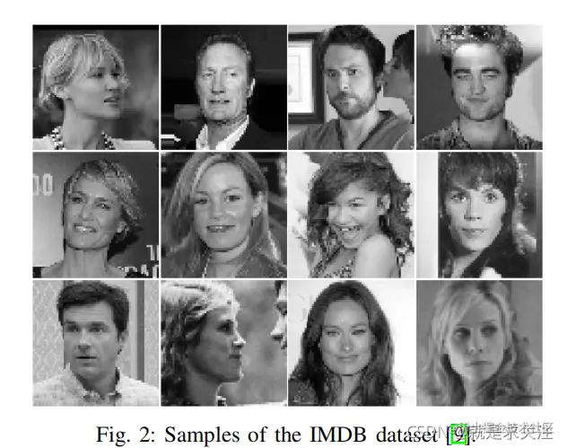 IMDB是一个包含名人人脸图像、年龄、性别的数据集,图像和年龄、性别信息从 IMDB 和 WiKi 网站抓取,总计 524230 张名人人脸图像及对应的年龄和性别。其中,获取自 IMDB 的 460723 张,获取自 WiKi 的 62328 张。在本次实验中,IMDB 性别数据集包含 460 723 个 RGB 图 像,其中每个图像被标注属于“女性”或“男性”类。