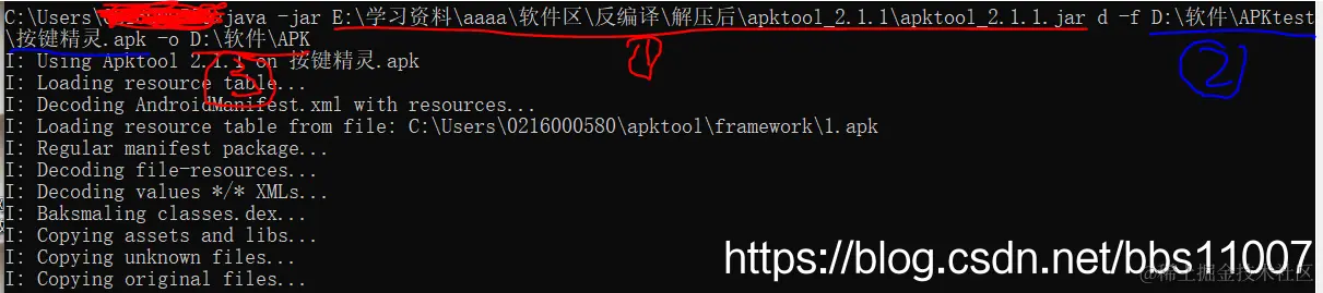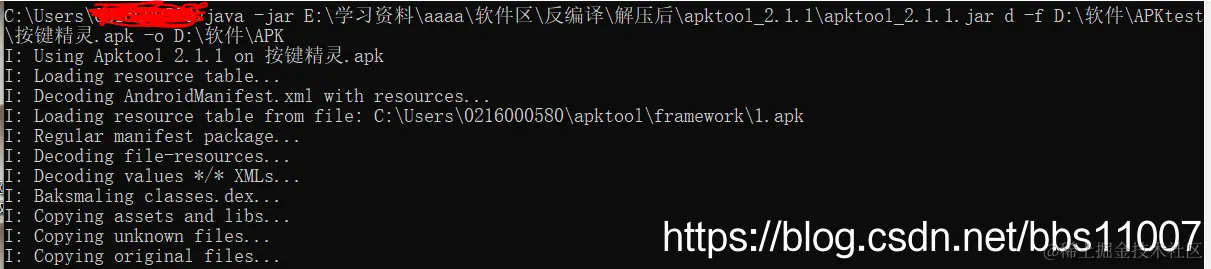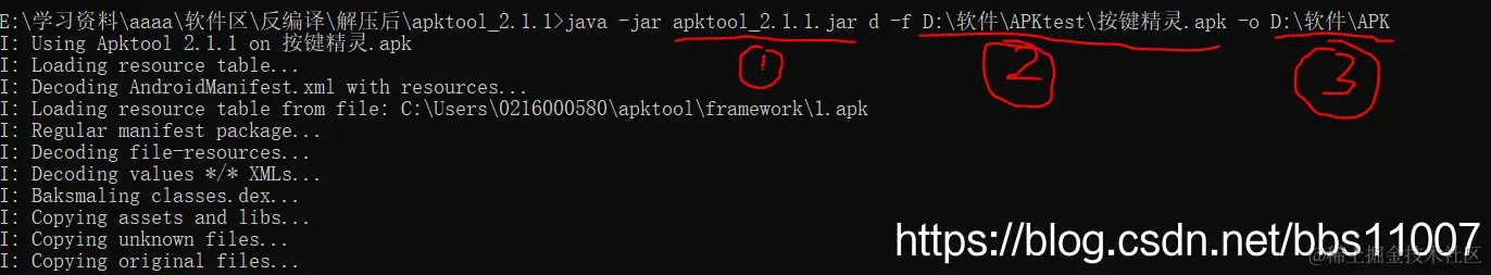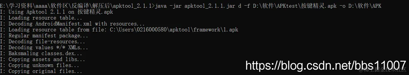 2.我们也可以直接跳过第一步,在任何路径下直接:java -jar E:\学习资料\aaaa\软件区\反编译\解压后\apktool_2.1.1\apktool_2.1.1.jar d -f D:\软件\APKtest\按键精灵.apk -o D:\软件\APK