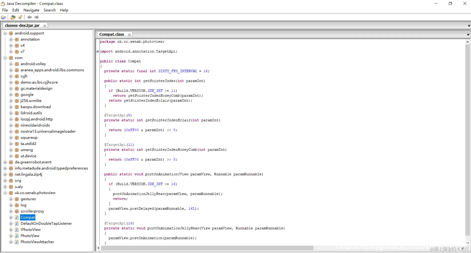 最后一步:查看反编译的源码是否混淆,一般有a、b、c、d、ab、ac这样显示的类或者变量都是做了混淆,否则是源码没有混淆。