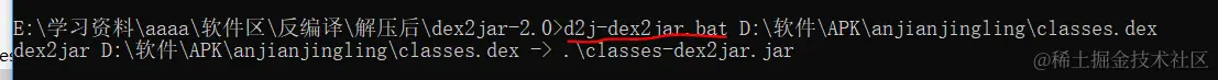 3.输入:d2j-dex2jar.bat classes.dex文件路径(即直接把该文件拖进去即可)----这时成功后会出现:”classes-dex2jar.jar“