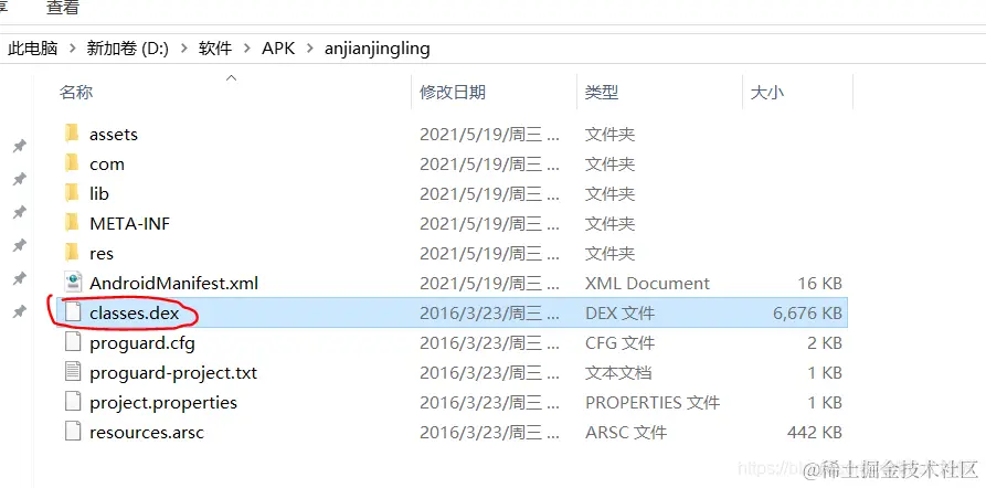 类似解压zip压缩包一样,用右键直接解压apk,得出一个”classes.dex“这个文件