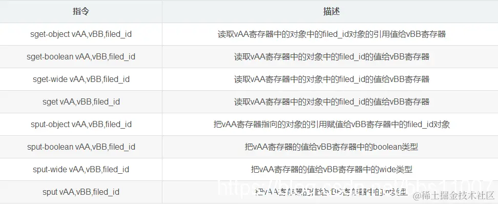 •arrayop vAA, vBB, vCC:对vBB寄存器指定的数组元素进入取值与赋值。vCC寄存器指定数组元素索引,vAA寄存器用来存放读取的或需要设置的数组元素的值。读取元素使用aget类指令,元素赋值使用aput类指定,根据数组中存储的类型指令后面会紧跟不同的指令后缀,指令列表有 aget, aget-wide, aget-object, aget-boolean, aget-byte,aget-char, aget-short, aput, aput-wide, aput-object, aput-boolean, aput-byte, aput-char, aput-short。