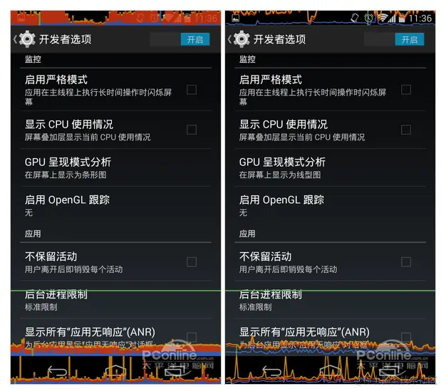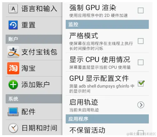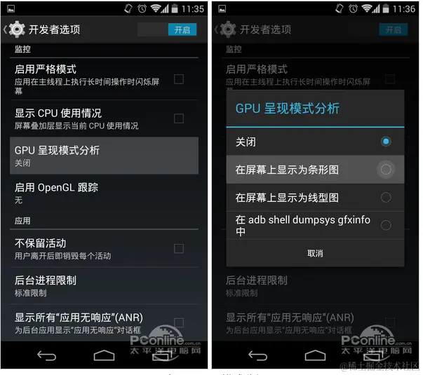 1.在设置里打开GPU呈现模式分析。点击Android设备的“设置”->"开发者选项",然后勾选“GPU显示配置文件”。