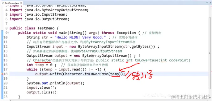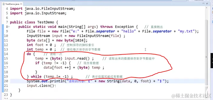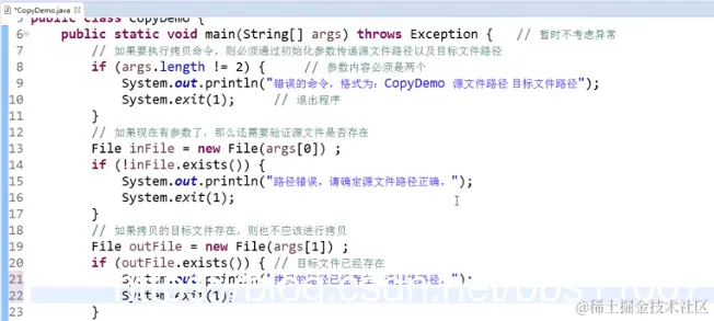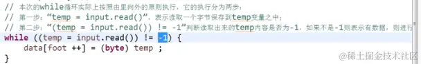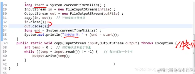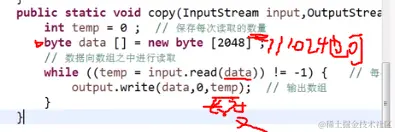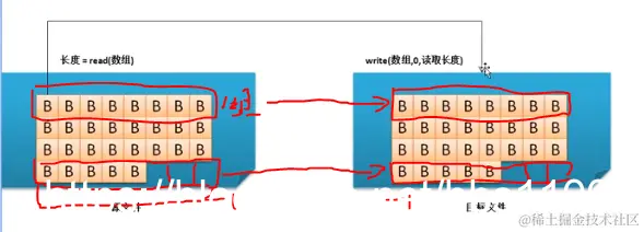 虽然实现了拷贝操作,但是这样的拷贝操作无法忍受。如果每次只拷贝单个字节,这是不可能的事情,利用数组来提升拷贝的性能,可以将数据读取到数组中,然后一次性将数组输出