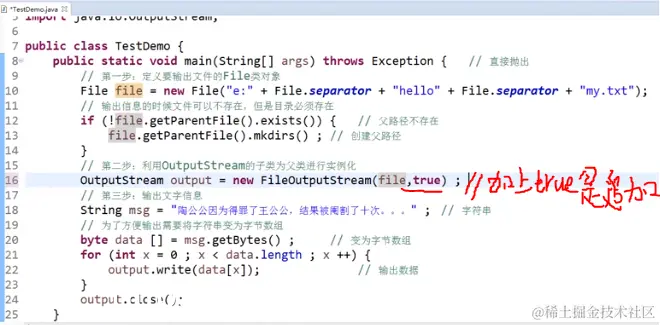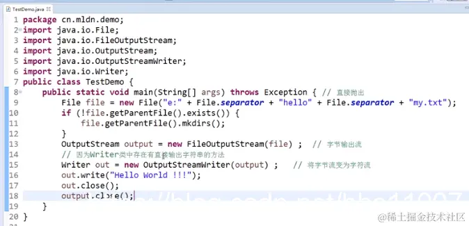 OutputStream范例代码(在下面),把close()去掉(文件也删除),执行的时候,会新生成文件并写入内容(能直接存储)