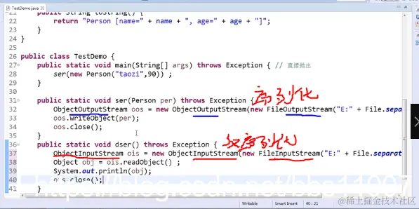 当需要写入多个对象到文件中时,建议先将多个对象放入一个集合对象中,然后将集合对象看做一个整体只需要调用以此wreteObject方法就可以吸入所以内容,此时只需要调用以此readObject方法就可以将所以内容读取出来,这样就避免了通过返回值判断是否读取到文件的末尾。