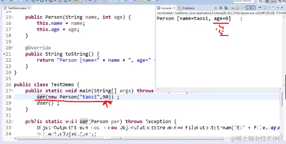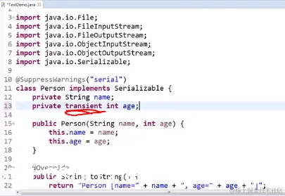 由于transient关键字作用,所以当数据被反序列化后,此数据为其对应类型的默认值。age=0是默认值