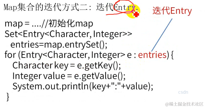 第2种遍历方法(常用):我们想一个个取出来,就想到使用迭代器,但是Map集合没有迭代器,但是有个entrySet()方法,就是把Map集合转换为Set集合