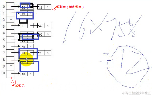 简单的哈希表结构:链表数组,如下图:由数组+链表构成;(还要更复杂的)