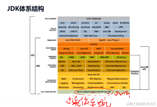 JDK包含JRE,JVM在JRE最底层,有堆和栈的概念,如图