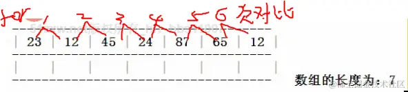 思路:就是一个个比较,下标0开始跟下标1比较,总共6次循环,每次循环若满足条件就替换,如23>12比,这两个就互换位置,以此类推。
