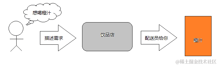 然而到了今时今日,由于饮品店的盛行,当我们想喝橙汁时,第一想法就转换成了找到饮品店的联系方式,通过电话等渠道描述你的需要、地址、联系方式等,下订单等待,过一会儿就会有人送来橙汁了。