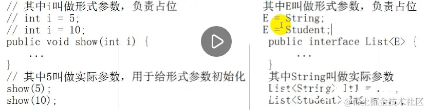 只要就尖括号,不管里面是什么都当做是泛型,但是<E>的 E是什么意思,就是形式参数负责占位,而使用集合时<>中的数据类型相当于实际参数负责给形式参数初始化,当初始化完毕后所有E替换为实际参数表示的类型进行使用。