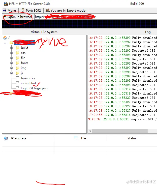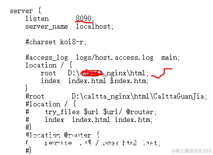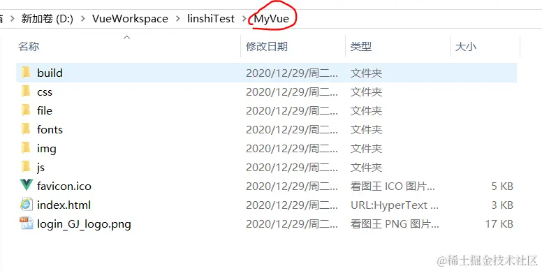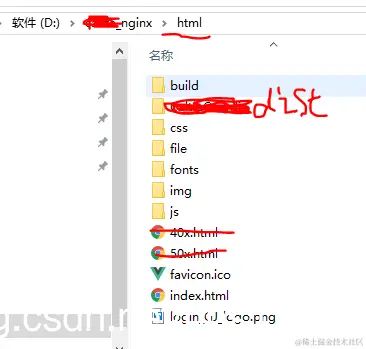 说明:这个index.html是dist里的,nginx下载的时候也有一个,我改名教40x.html了,被我划掉的都没有用,其他的都是dist的内容。一般正常的试:D:/nginx/html/dist(MyVue)