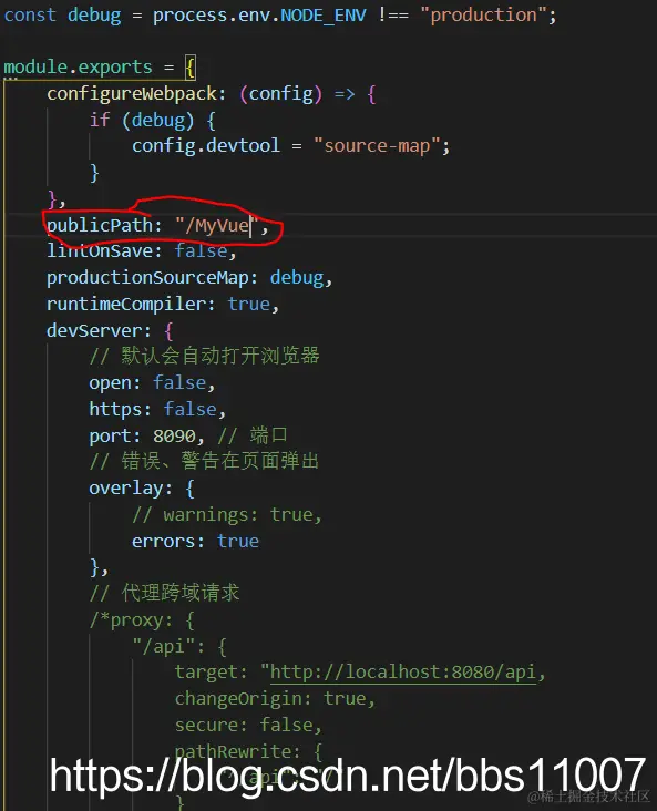 其二、是配置文件出的问题。我们build前需要检查下项目中的vue.config.js,可以module.exports = {}里加上publicPath:: "/MyVue"跟上文件名。然后再build
