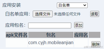 白名单应用:<input type="file" style="width: 200px; height: 30px;" accept=".apk" id="BfileappInstallC" οnchange="BappSelect()"/>