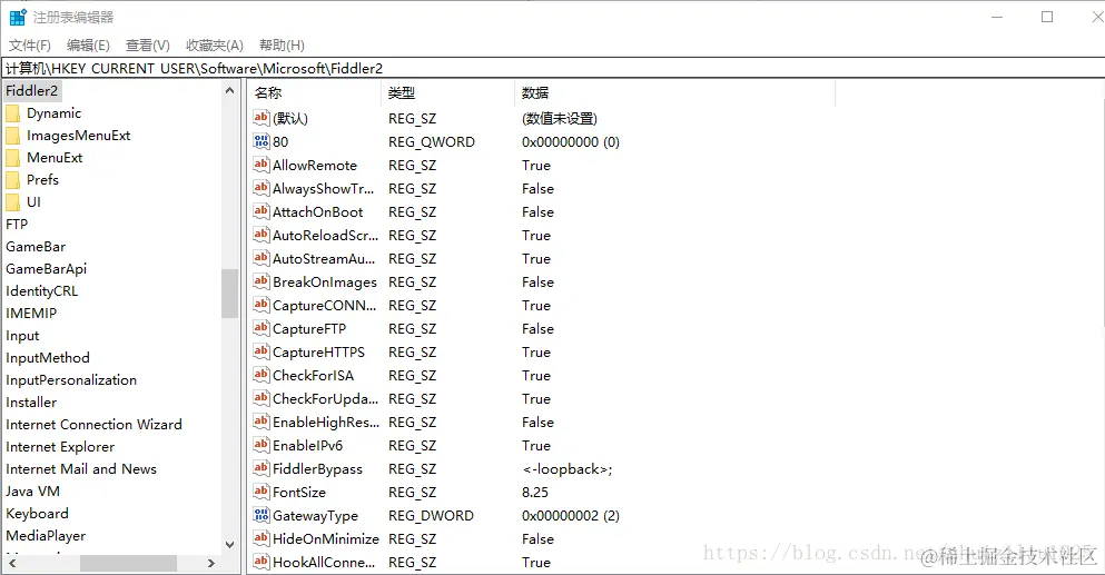 b、打开注册表(cmd-regedit),在HKEY_CURRENT_USER\Software\Microsoft\Fiddler2下创建一个DWORD,值置为80(十进制)