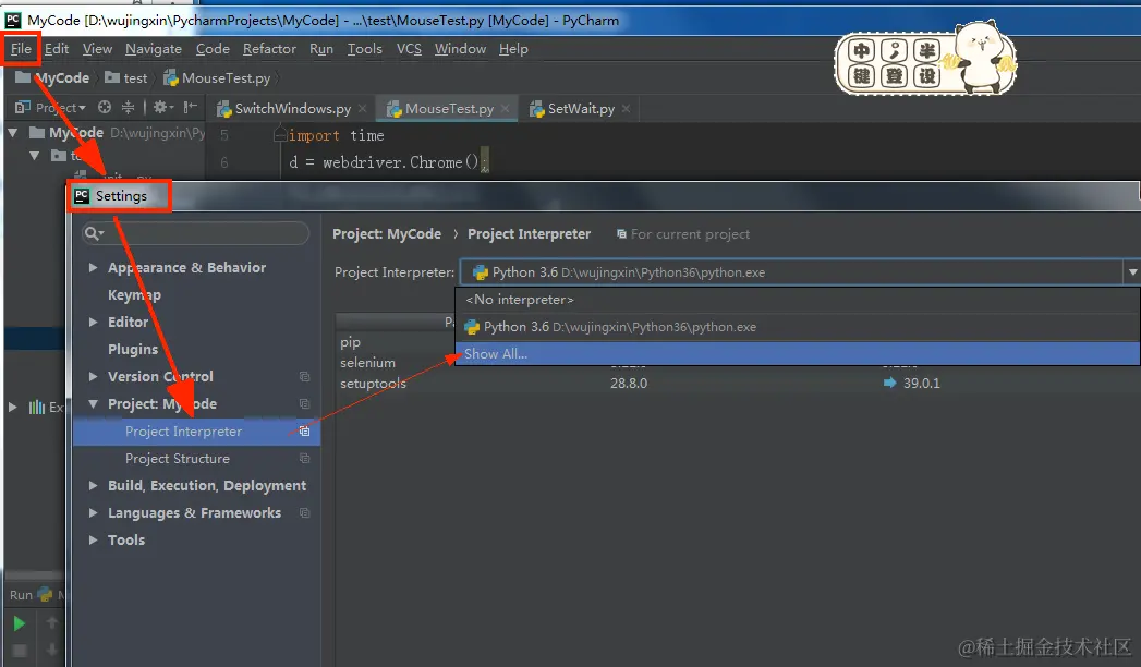 I.打开pycharm,点击Settings,找到Project Interpreter,点击右边的下拉菜单下的show All...选项,如图: