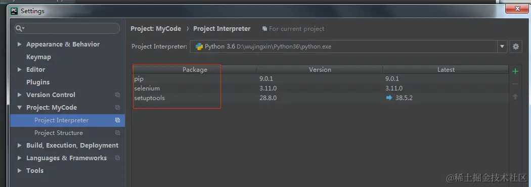 III.在I步骤的project Interpeter那里选择你加入的python路径,如出现pip、selenium、setuptools模块则代表成功了,可以使用selenium了