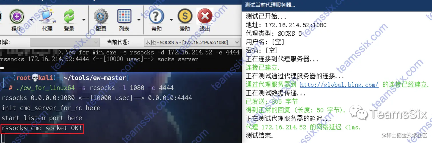 这条命令表示在本地开启 socks 5 服务,并反弹到 vps 的 4444 端口,如果代理建立成功,在 VPS 端就会看到 rssocks cmd_socket OK! 的提示。