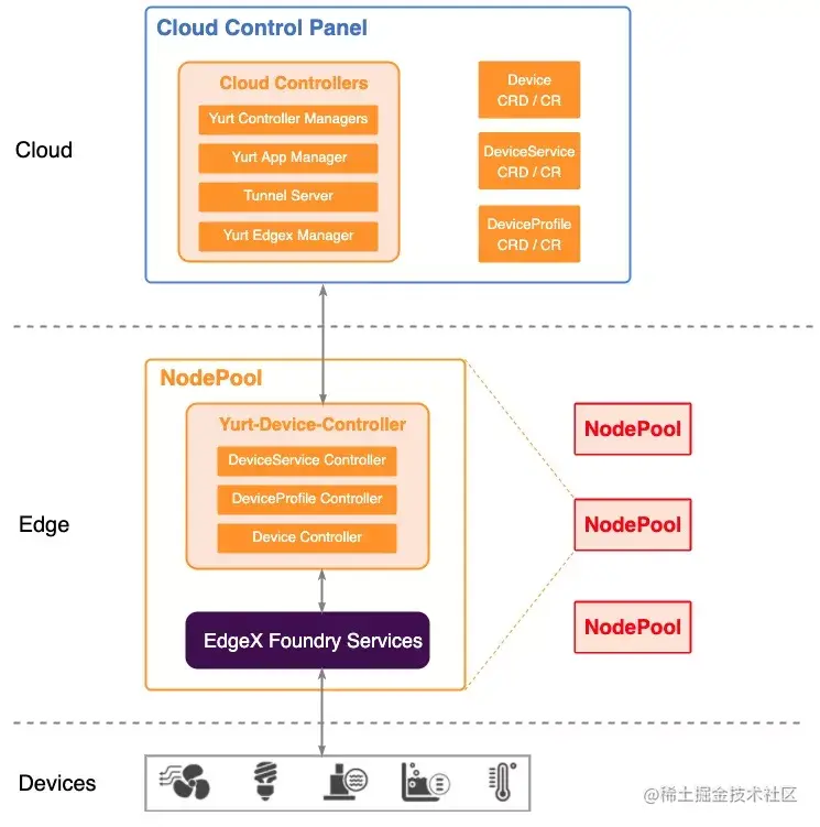 其次引入 yurt-device-controller 组件,它是 Kubernetes 系统和边缘计算平台(如 EdgeX Foundry)的联结器,使用户可以通过 Kubernetes CRs 来管理边缘设备。一个 yurt-device-controller 实例对应一个节点池的 EdgeX Foundry。整体部署架构如下: