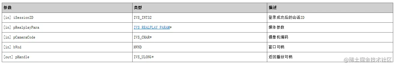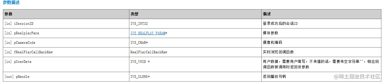 IVS_INT32 iRet = IVS_SDK_StartRealPlayCBRaw(iSessionID, &RealplayPara, strCameraCode, RealPlayCallBackRawFunc, "test", &ulRealPlayHandle);if (IVS_SUCCEED == iRet)