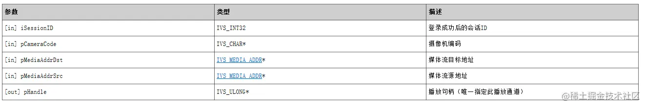 iRet = IVS_SDK_StartRealPlayByIP(iSessionID, strCameraCode, &MediaAddrDst, &MediaAddrSrc, &ulHandle);