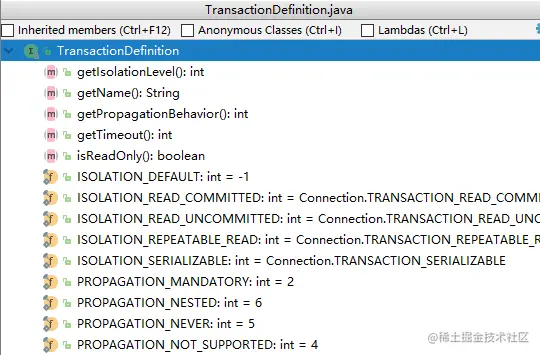 getTransaction() 是根据传入的 TransactionDefinition 获取一个事务对象,TransactionDefinition 中定义了一些事务的基本规则,例如传播性、隔离级别等。
