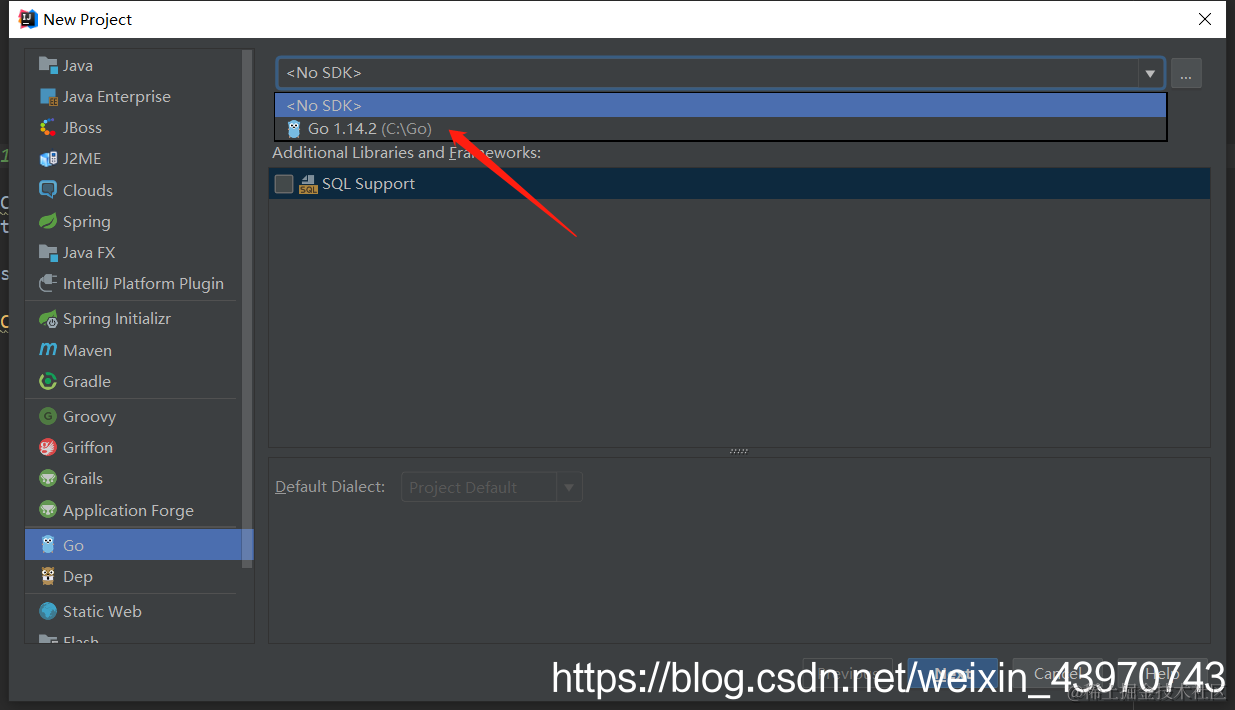 1、当安装好了Go插件,重新启动IDEA之后选择新建项目工程,就可以在左边的导航栏中看到Go 项目的选项。