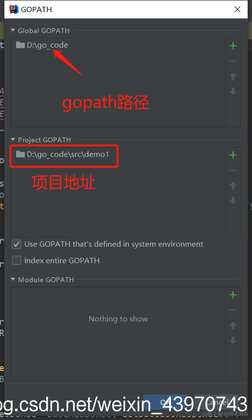 3.选择你配置GOPATH 的路径存放项目,我是自定义Project名叫demo1