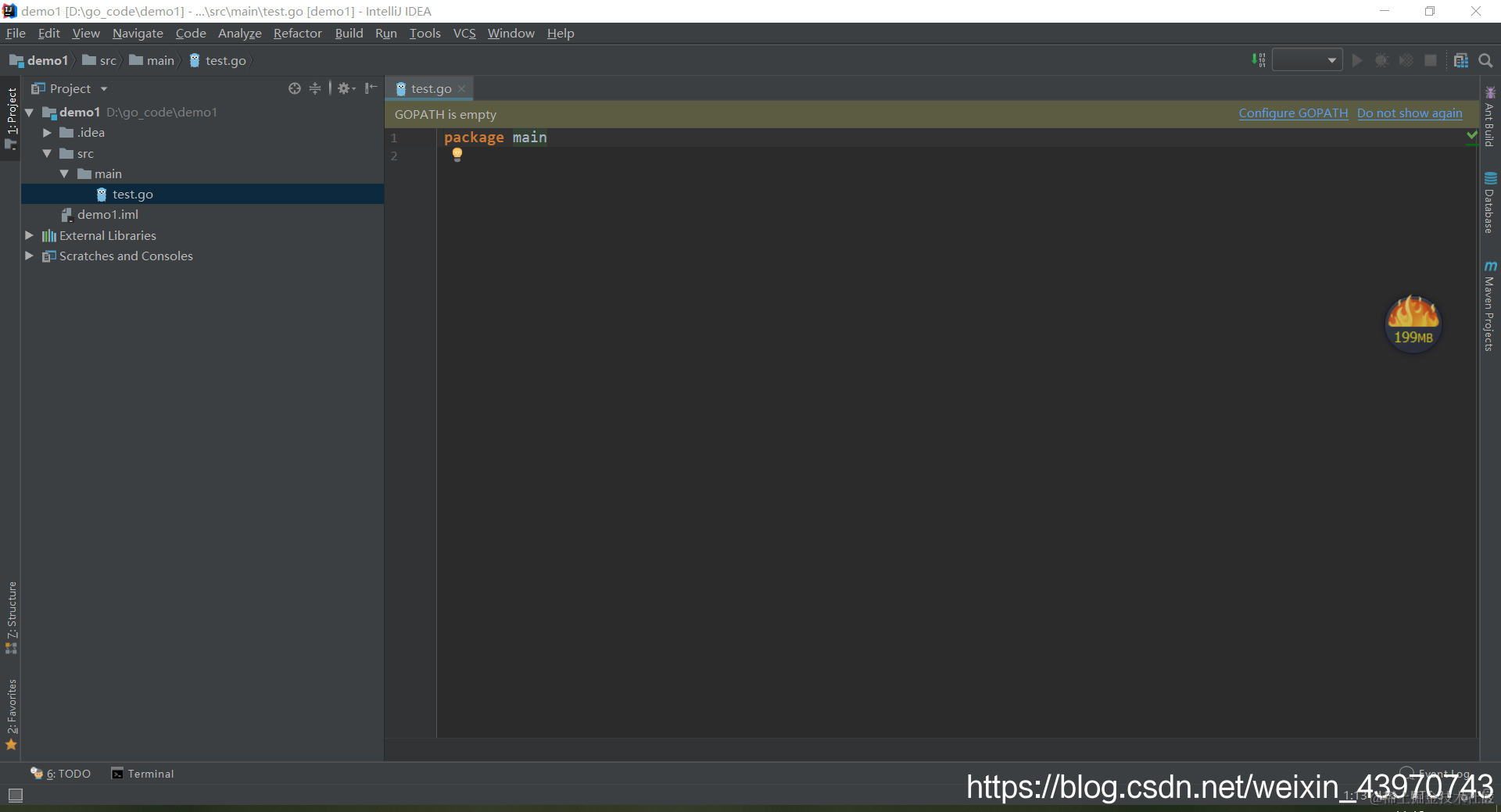 5、创建一个src-》main-》test.go文件,然后点击右上角的 Confiqure GOPATH ... 配置你本项目中的Gopath