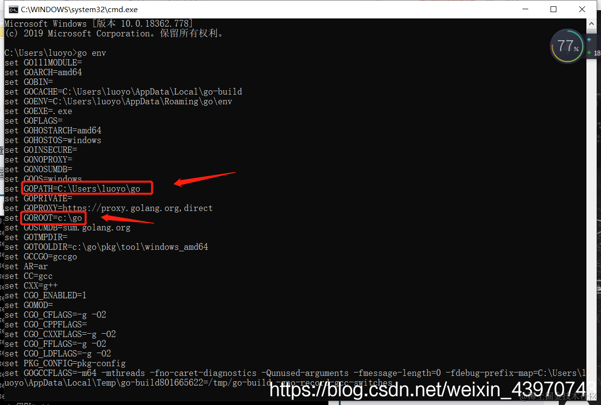 - 运行cmd,输入命令go env 并回车,查看信息与上面的配置相符即可;