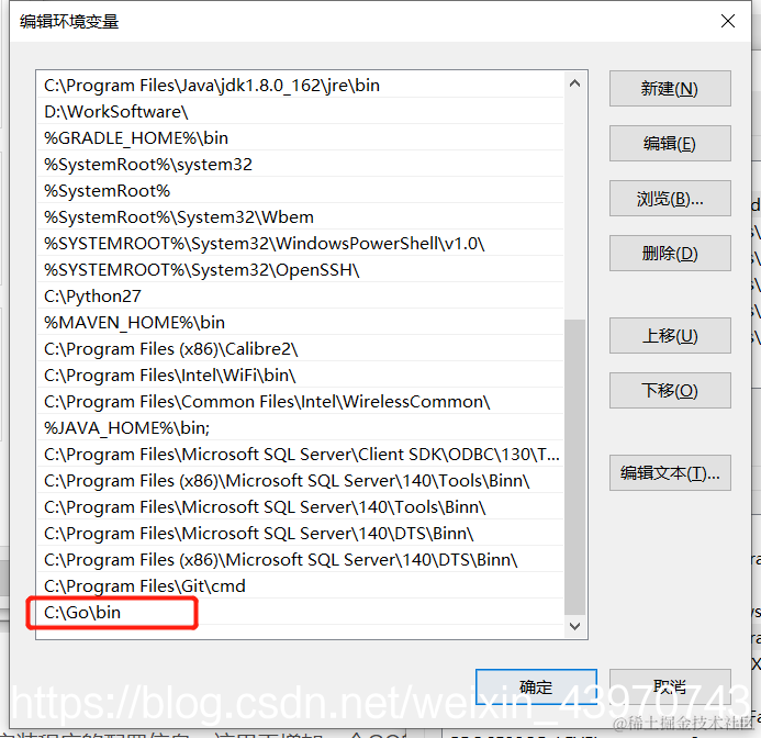 检查是否有C:\Go\bin(你安装SDK下的bin路径),没有则手动点击编辑在最后一行添加上!(我的是安装时自动生成了);