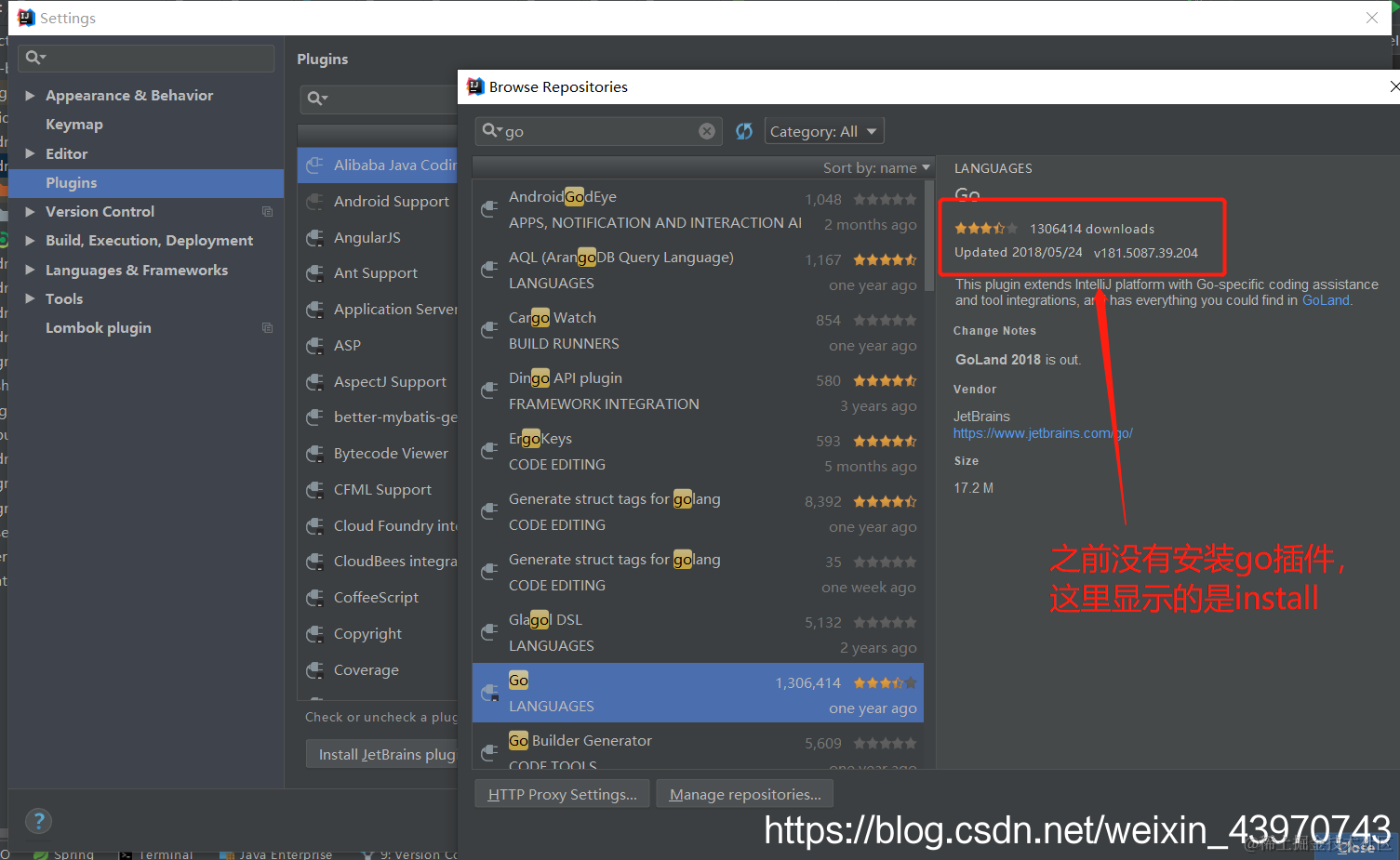 2. 搜索Go ,然后选择Go,弹框右上角 install 即可。 在给IDEA 安装新插件之后,都需要重新启动IDEA ,以加载新的插件功能。