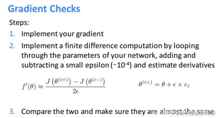 - Gradient Check,如果你觉得网络feedforward没什么问题,那么GC可以保证BP的过程没什么bug。 值得提的是,如果feedforward有问题,但是得到的误差是差不多的,GC也会感觉是对的。大多情况GC可帮你找到很多问题!步骤如下: