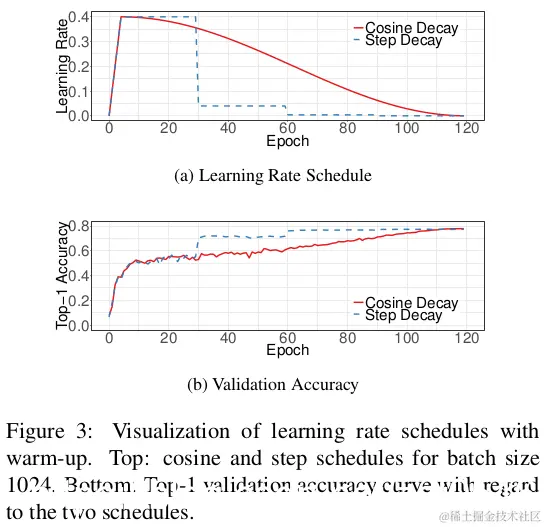 1、学习率衰减策略采用cosine函数,这部分的实验结果对比可以参考Figure3,其中(a)是cosine decay和step decay的示意图,step decay是目前比较常用的学习率衰减方式,表示训练到指定epoch时才衰减学习率。(b)是2种学习率衰减策略在效果上的对比。