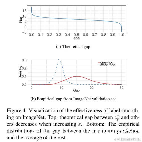 2、采用label smoothing,这部分是将原来常用的one-hot类型标签做软化,这样在计算损失值时能够在一定程度上减少过拟合。从交叉熵损失函数可以看出,只有真实标签对应的类别概率才会对损失值计算有所帮助,因此label smoothing相当于减少真实标签的类别概率在计算损失值时的权重,同时增加其他类别的预测概率在最终损失函数中的权重。这样真实类别概率和其他类别的概率均值之间的gap(倍数)就会下降一些,如下图所示。